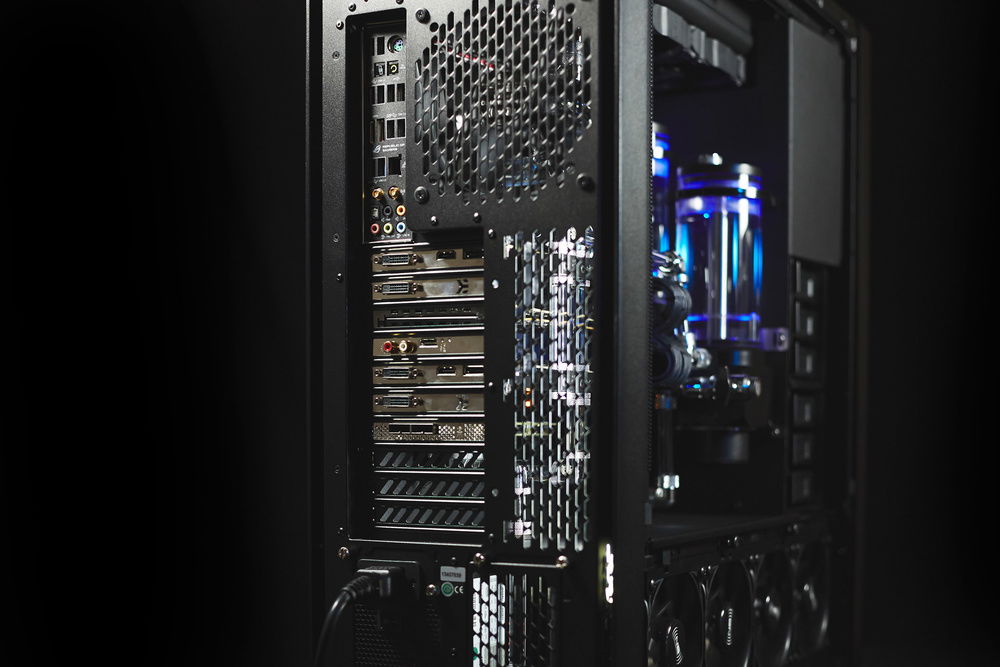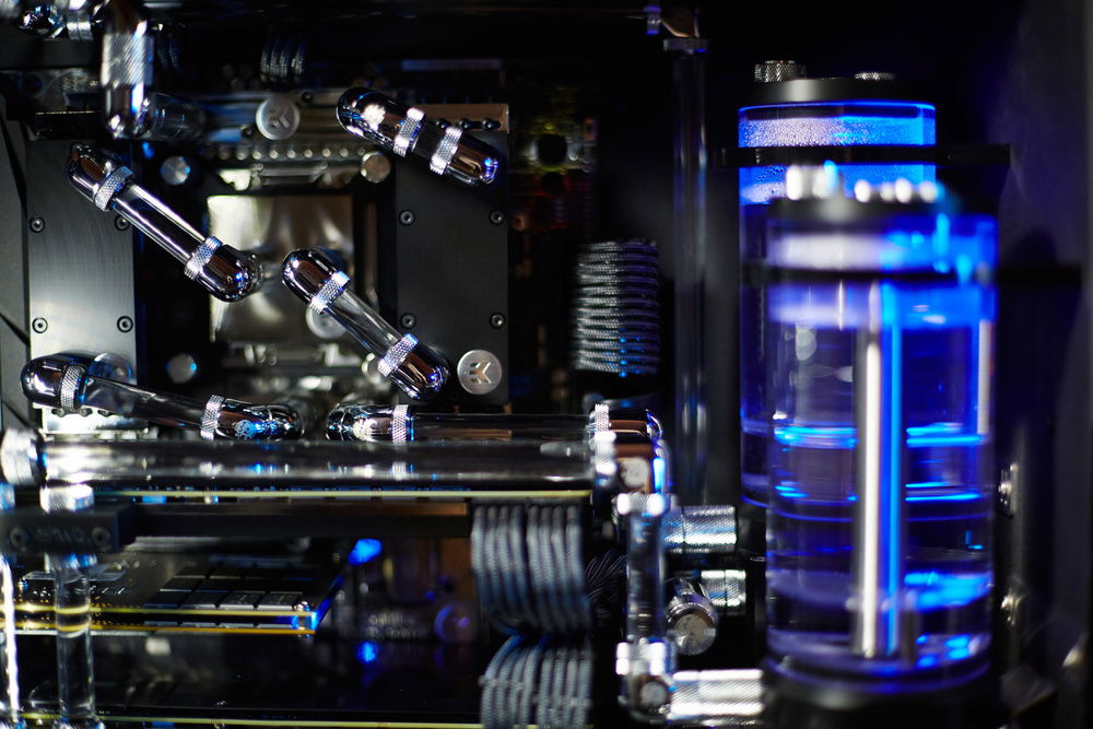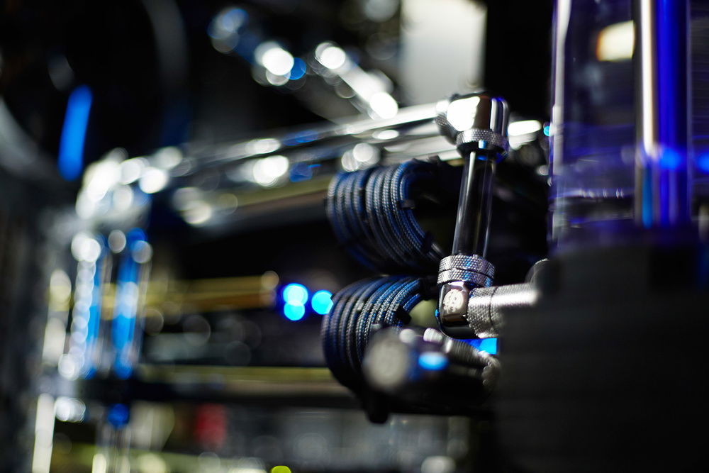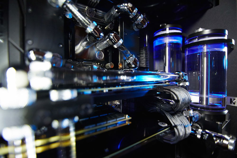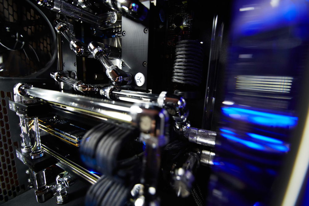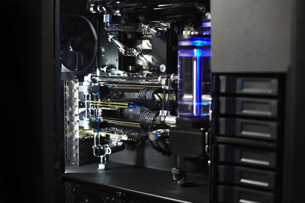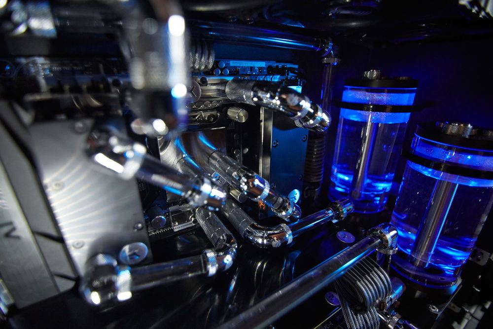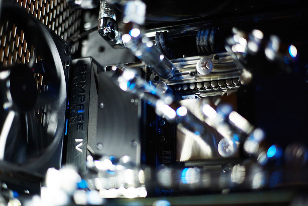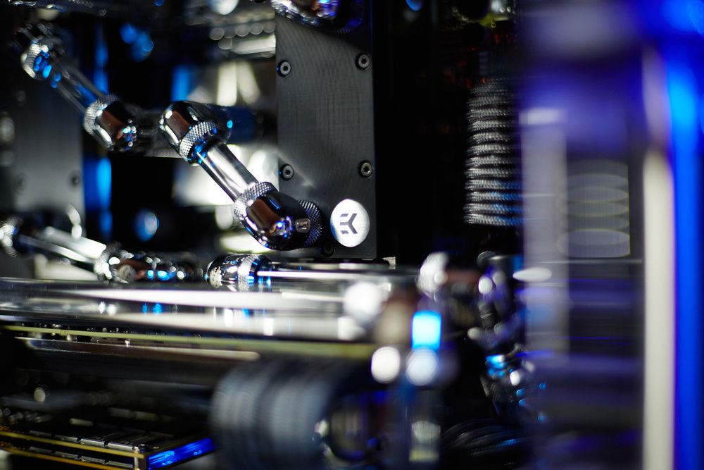Build primarily dedicated for a video rendering by graphic cards. Customer required very silent running of the workstation with a cooling of 4 cores of GPU, 6 cores of CPU, chipset, mosfets of the motherboard, RAMs and SAS controller and requirement for the top design in black color with combination of nickel plated waterooling components.