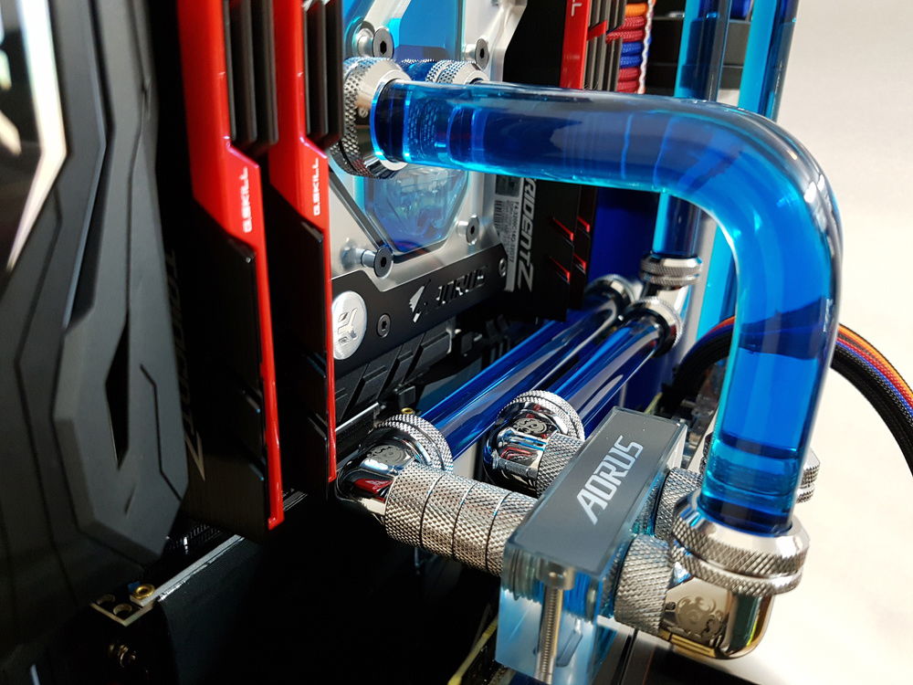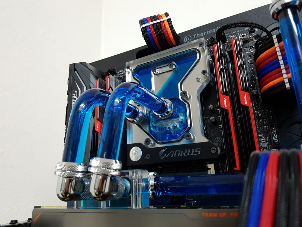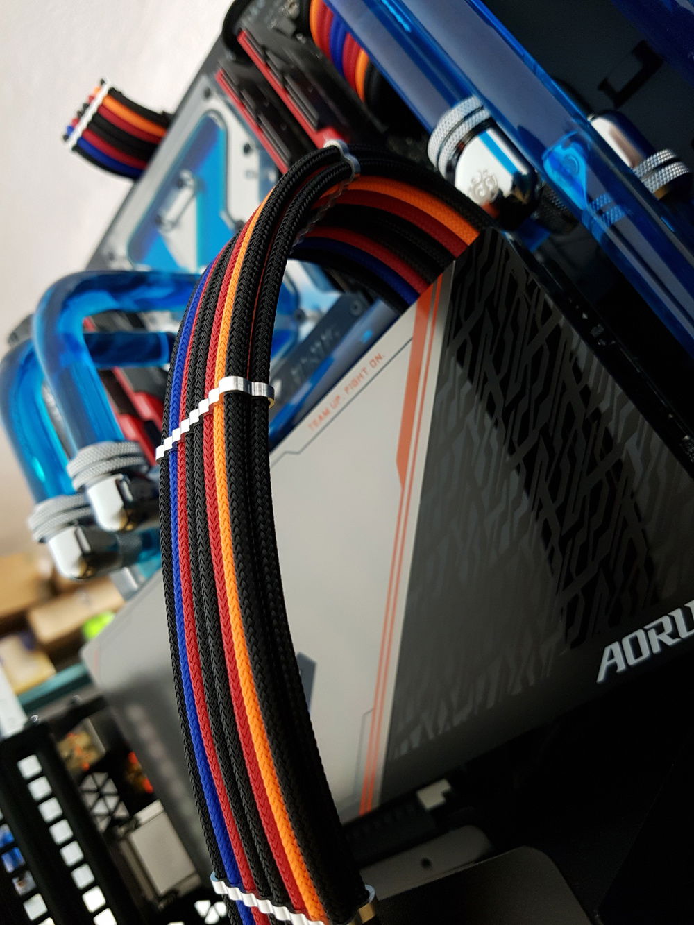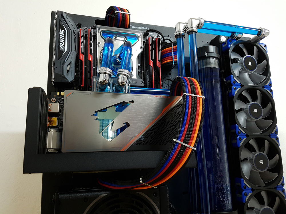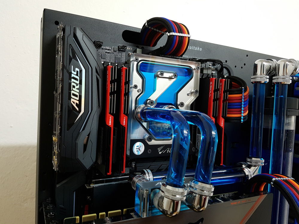 Custom watercooled project for customer based on Gigabyte AORUS components, Thermaltake W100 case, EKWB / Bitspower watercooling parts and our own custom PSU cables.