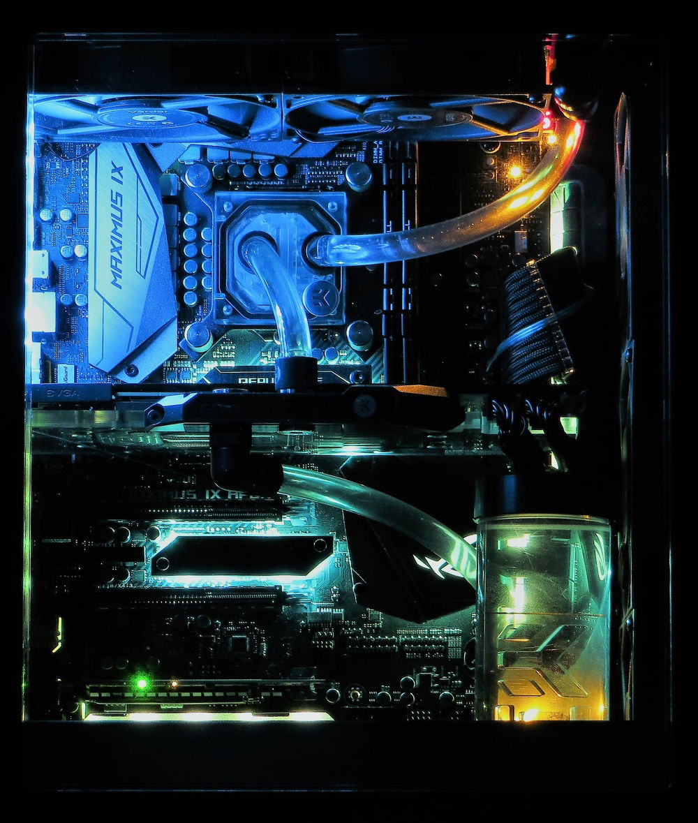 My previous build, from around November 2017, aiming at compact ATX with minimal tubing visible. I changed the loop to parallel later, which made the build that much cleaner IMO. I didn't take pictures of that, though, so here the initial inline version.