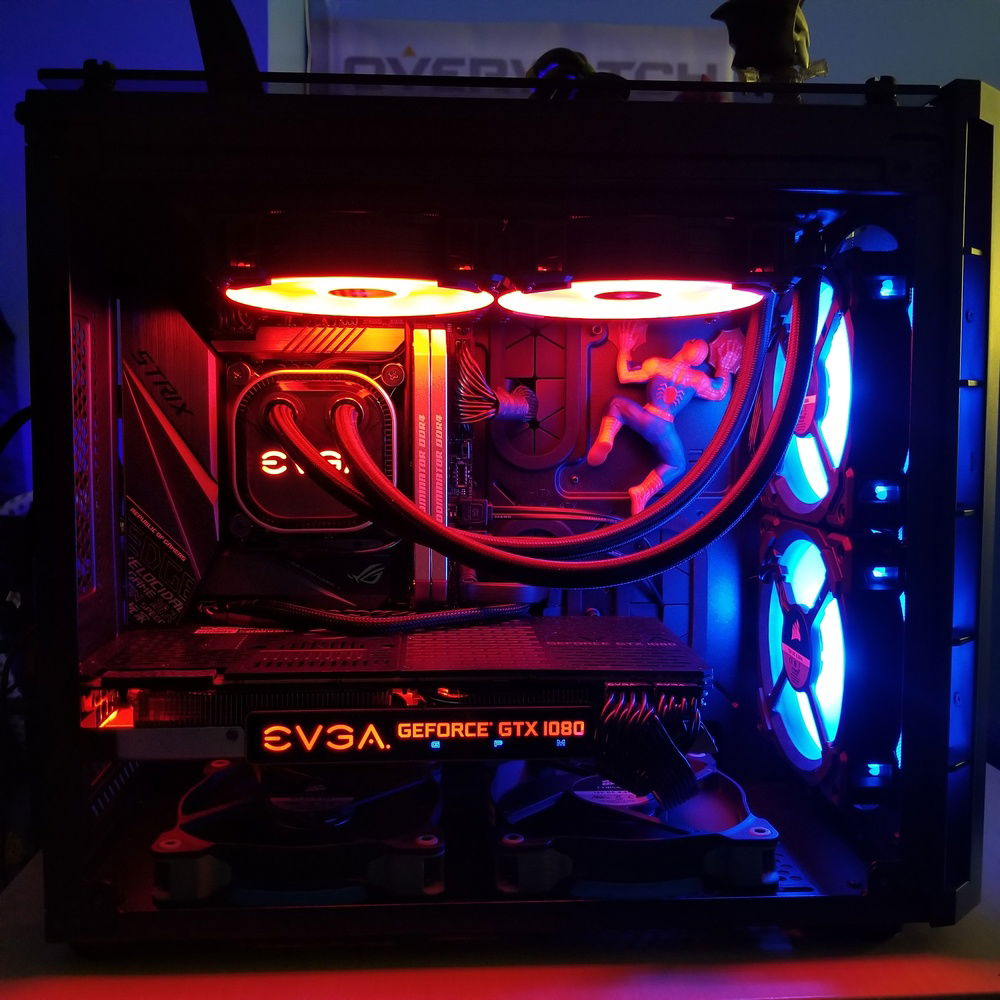 Case- The case was another tough choice. I really wanted to get a matx board because I feel like it's the perfect balance of connectivity and size. After much consideration my choices were ultimately between the Meshify Mini C or the Corsair 280X. My friends convinced me to get the 280X, which is technically a matx case but really favors itx boards. This is why I chose the ASUS itx board mentioned earlier. I'm glad I bought that combo but it got a little tough building it. My first plan was to have my 240 rad in the front, 2 fans on the bottom, and 2 fans on top. Visibly, it looked possible but I immediately bumped into obstacles. The rad wouldn't fit in front because the hoses hit the top fan so I thought about flipping the rad to have the hoses at the bottom but this would interfere with the GPU. I was left with no choice but to place it on the top as exhaust. I was really skeptical about doing that in fear of bad temps for my CPU but realized I have so much fresh air coming in I should be alright (it turned out ok). My next problem was the rad and fans interfering with the cables connected to the top headers on the mobo. This forced me into placing the rad on the farther 140mm fans placement holes using screws on one side of the rad and twist ties on the other. This worked but was a hassle to assemble. Cable management was a breeze because of the spacious chamber on the right for the PSU. After the build was complete there was this empty space right next to my front intake fans and I really wanted to occupy it with something. I thought about placing a sticker but then decided that was too simple. I began digging in the chest full of toys and found 2 Spider Man toys. One was the all black suit and the other the basic suit. I figured the regular one looked better inside so I placed it right where I wanted it and it's perfect. It then became Spider Man themed.