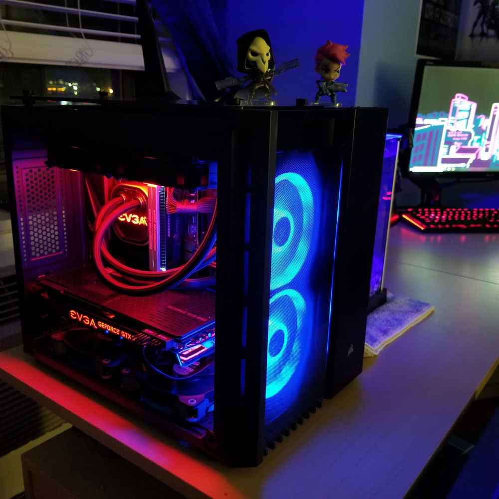 *This was setup and built in March 2019. I first wanted it to be silver themed but it turned into something else. More on that later. Also, the fan colors look a little weird in pictures but they look great in person. Top fans, pump, and GPU are set to max red and the front fans are max blue. Lúcio is also hidden behind Reaper in the pictures.